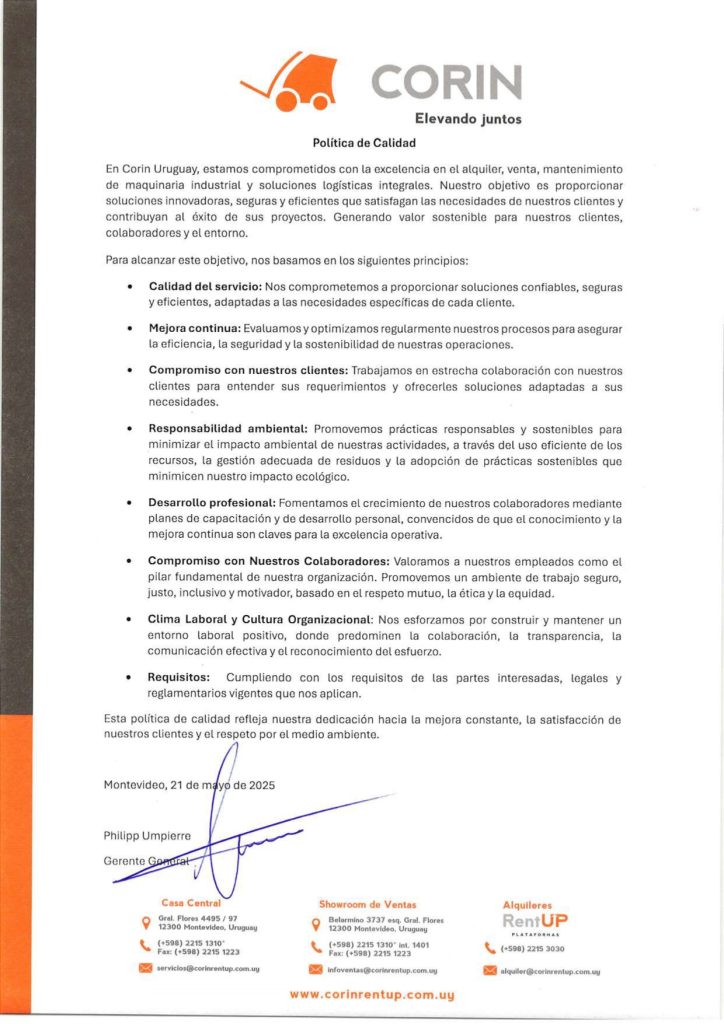 En Corin brindamos soluciones innovadoras, seguras y eficientes en maquinaria industrial y logística, comprometidos con la calidad, sostenibilidad, clientes, colaboradores y mejora continua.